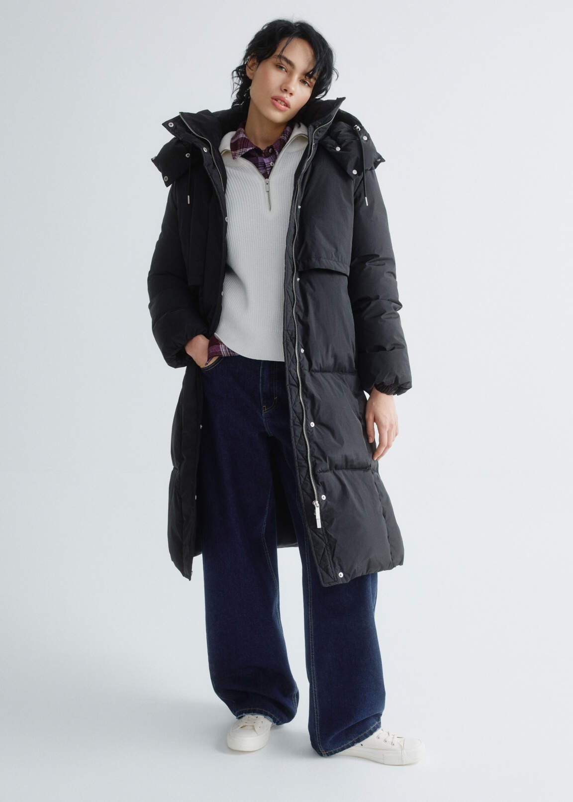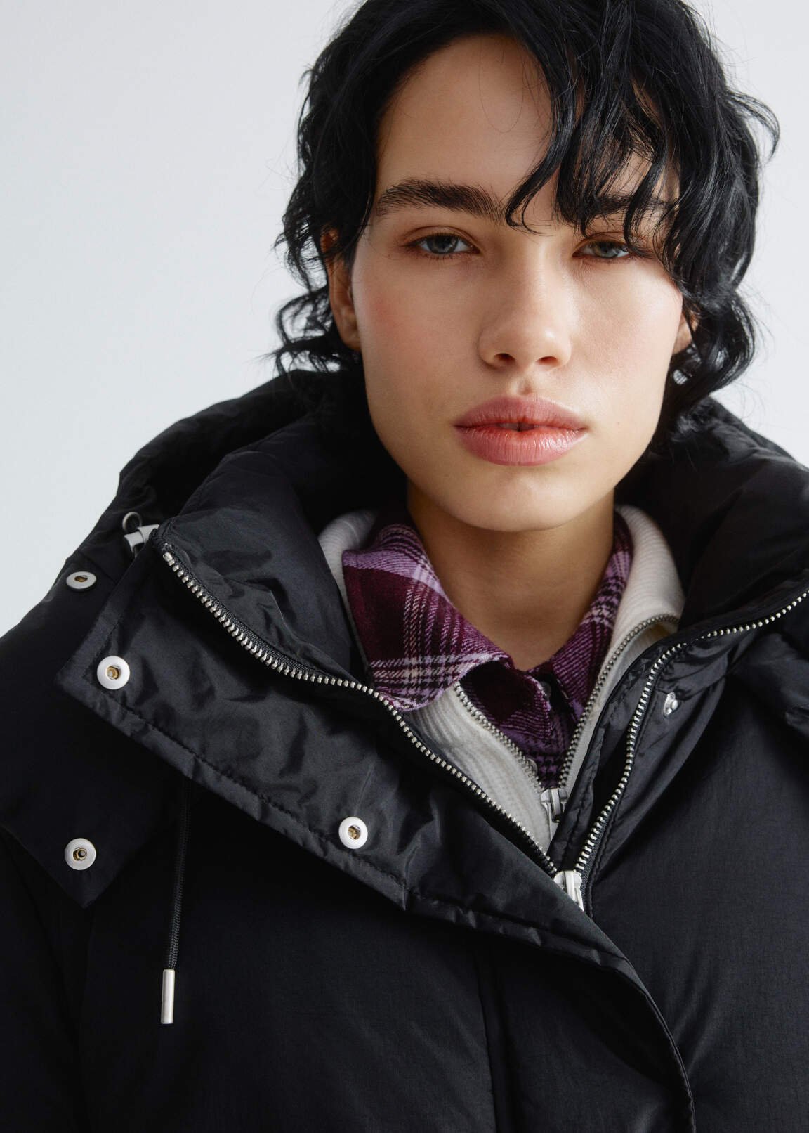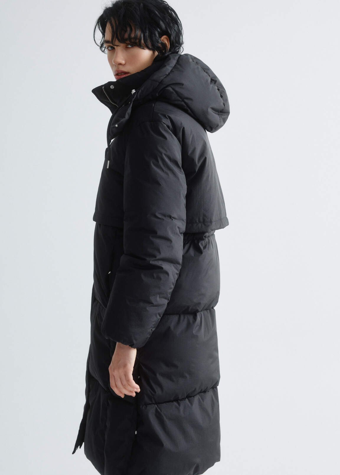 This quilted coat features a flap yoke at the back. Made from a lightweight, crinkled raincoat fabric with a water-repellent finish and a membrane on the reverse. It features a relaxed, straight cut with dropped shoulders and long, loose sleeves. It features a voluminous built-in hood, a snap-buttoned wind flap, and a zip closure. In-seam welt pockets, snap-buttoned side slits, and an internal welt pocket with a snap. Elasticated cuffs and a drawstring with stoppers at the hood and waist provide a secure fit and protection from the elements. Sofeelate, a recycled insulation material, is incredibly soft and easy to care for, retains heat well, and is lightweight. Recommended temperature range: 0 to -10°C. Model is wearing a size S. Measurements: 83/64/88, height 175.