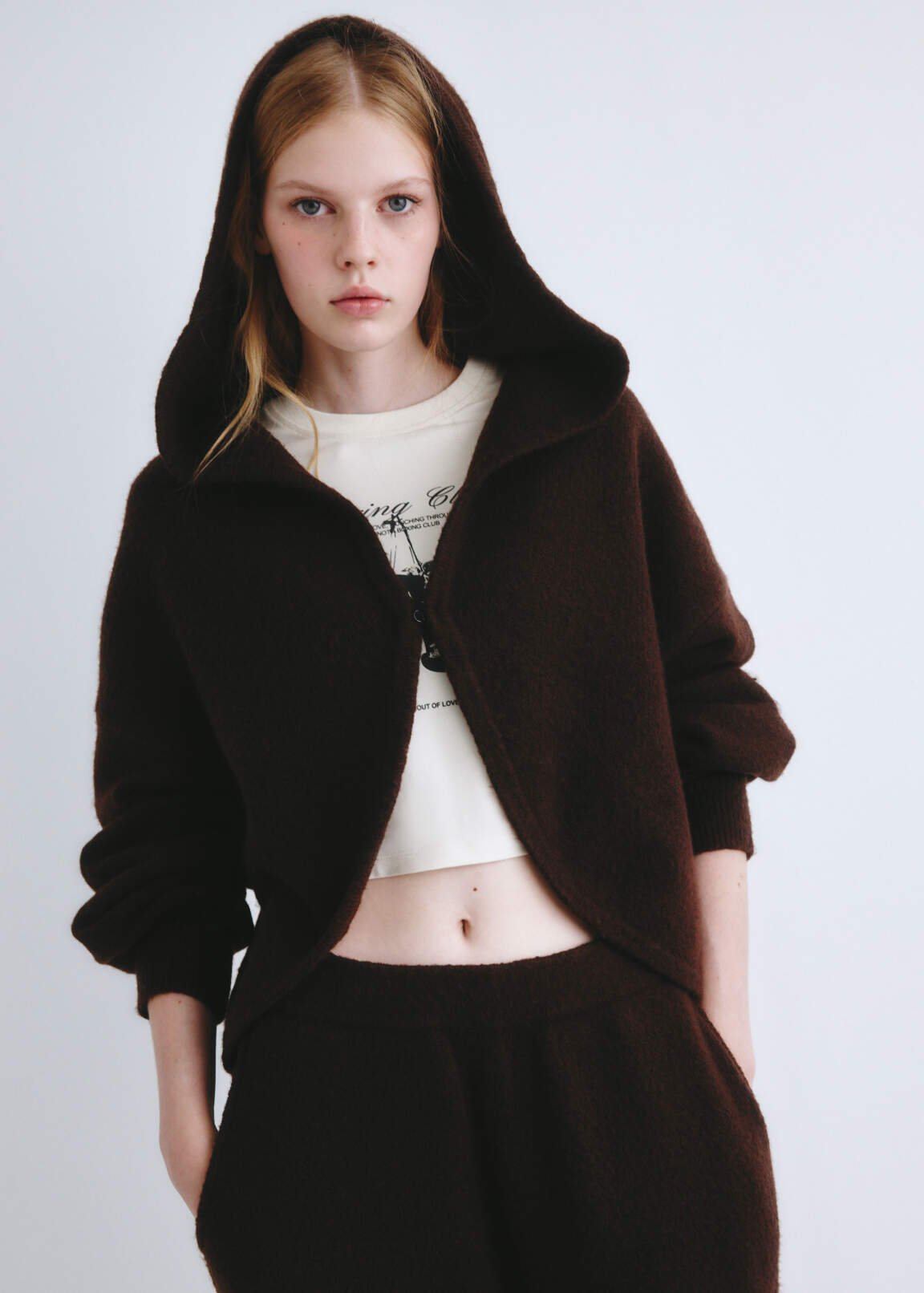 Knitted trousers. Relaxed, straight fit with full-length, tapered legs. Elastic waistband. Side-seam pockets. Elasticated hem. The collection includes a matching bolero, item number SL5810210604. Model is wearing a size XS. Measurements: 80/60/90, height 177 cm.