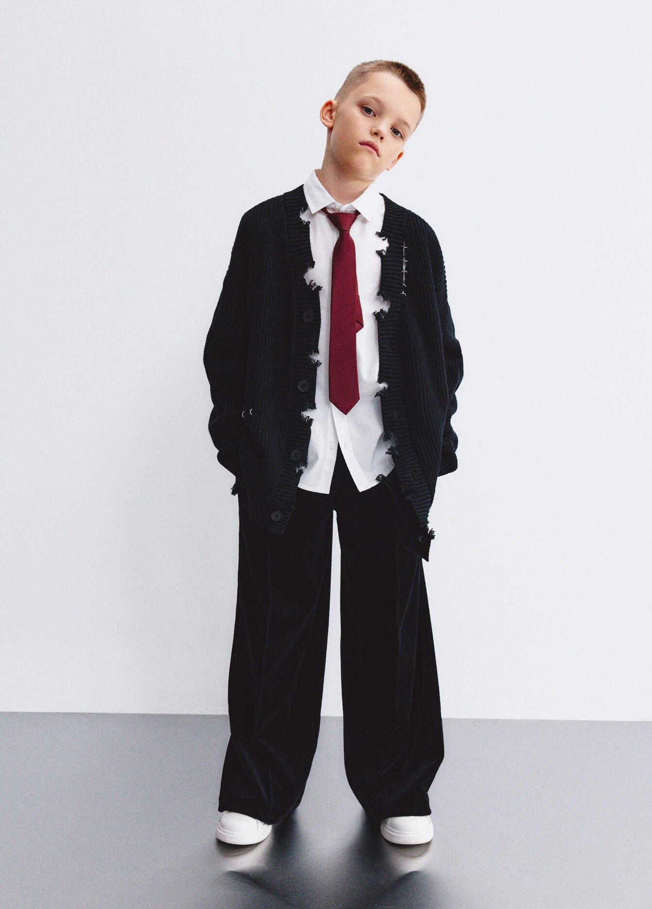 A grunge-inspired knit cardigan with ripped details and piercings. Made from a soft cotton blend, it features a relaxed, straight fit with dropped shoulders. It features a V-neck and loose, long sleeves. Ribbed cuffs and waistband. Button closure. A versatile style suitable for both girls and boys. New Year’s collection.