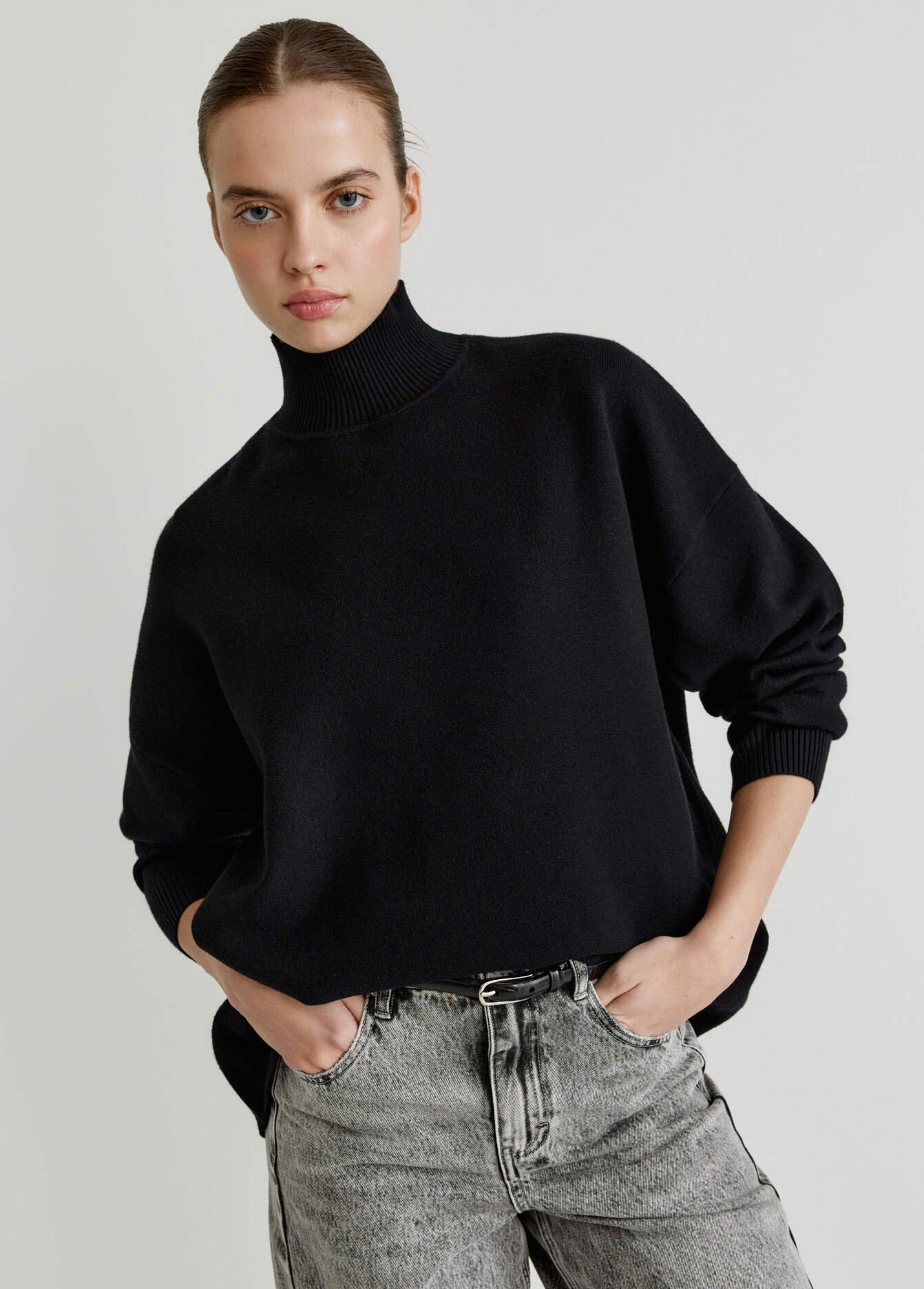 This sweater features a stand-up collar. It’s made from a dense viscose-blend jersey. It features a relaxed fit with dropped shoulders and long sleeves. The…