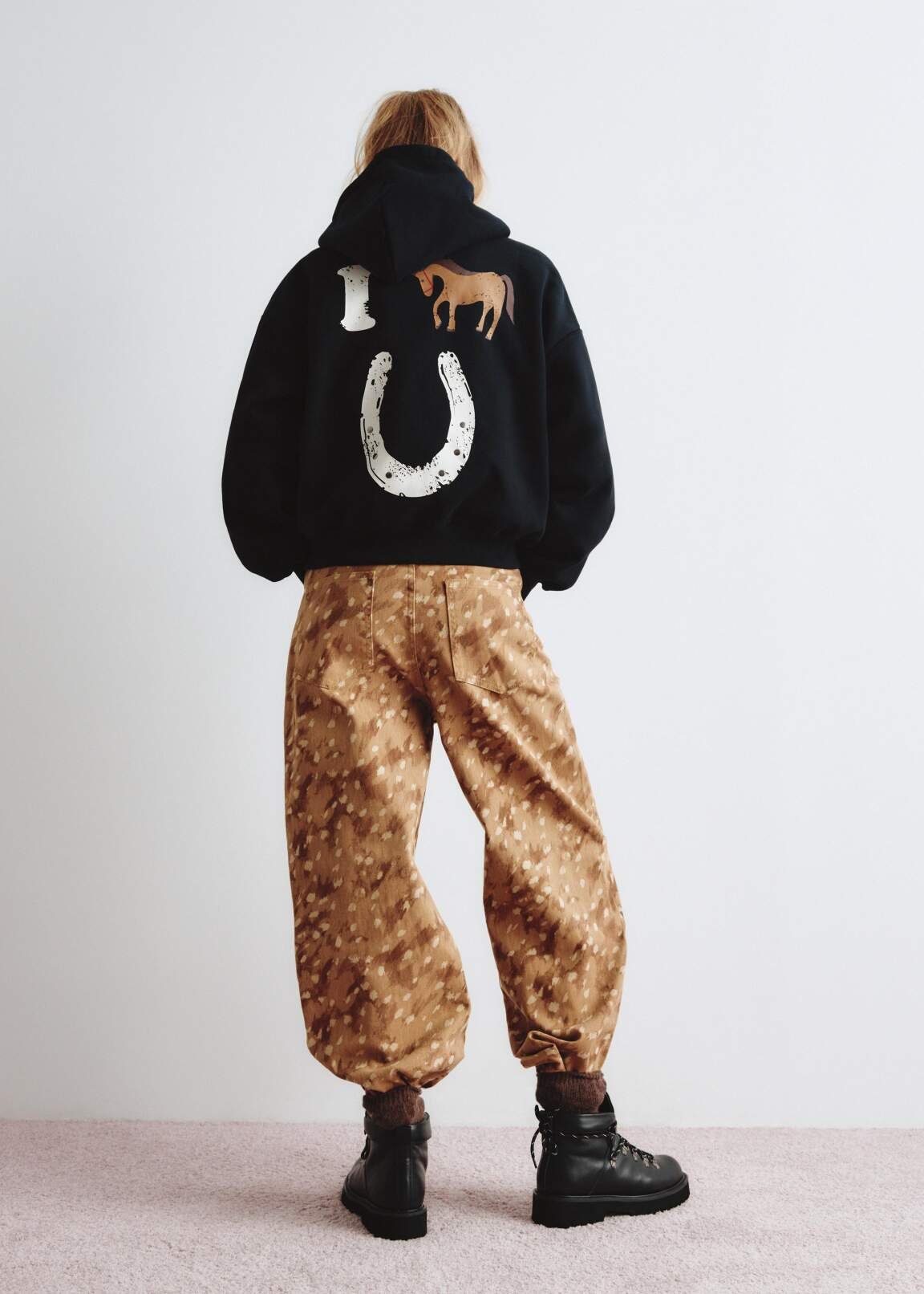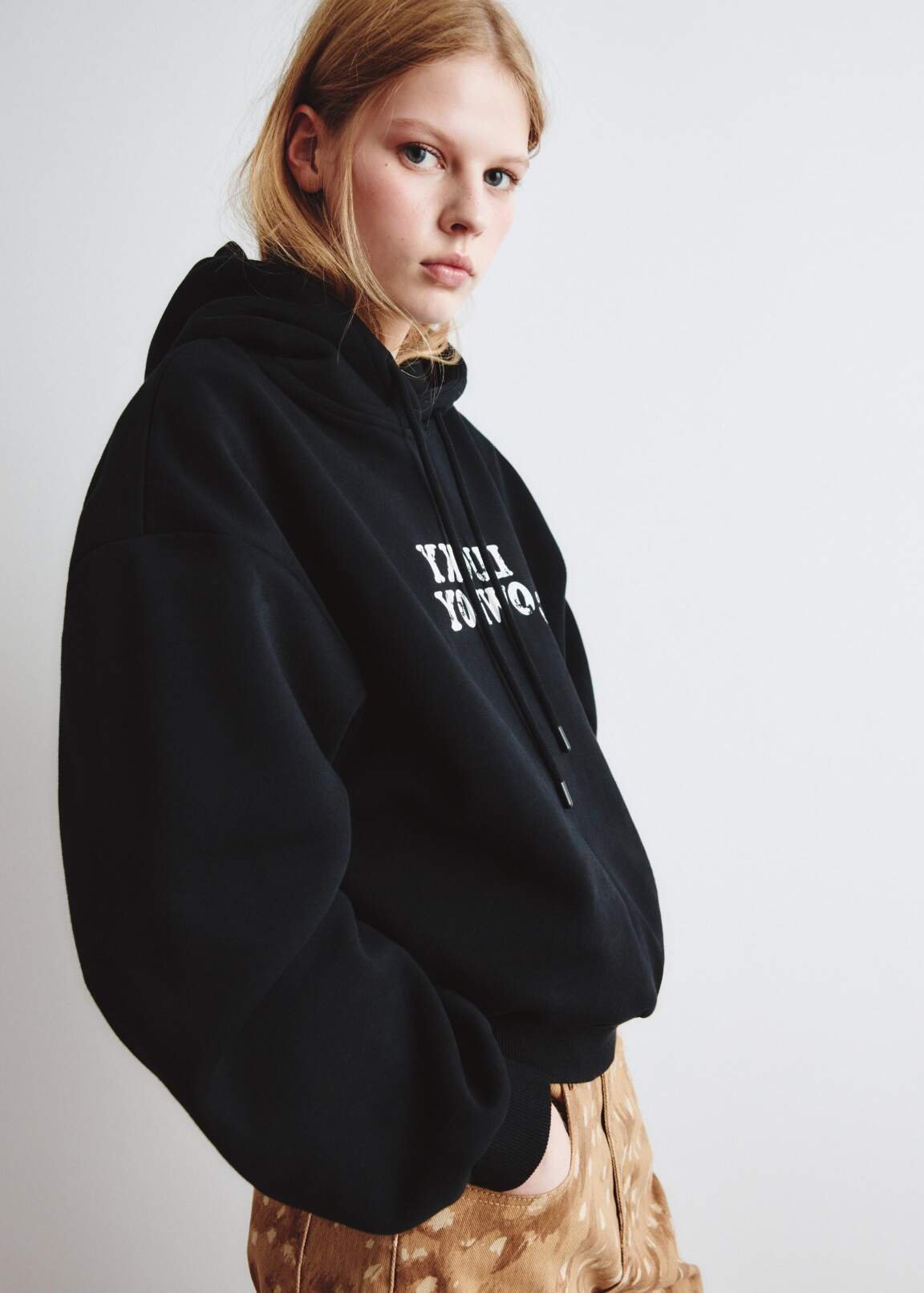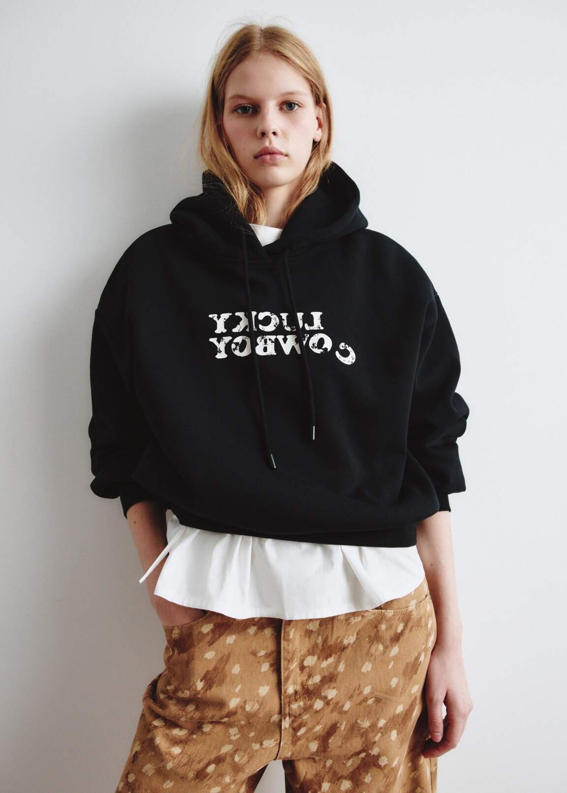 This printed hoodie features decorative metal panels on the front and back. It’s made of soft cotton-blend fleece with a brushed back for a comfortable feel. It features a relaxed fit with dropped shoulders, a hood, and long sleeves. Ribbed cuffs and waistband. Model is wearing a size S.