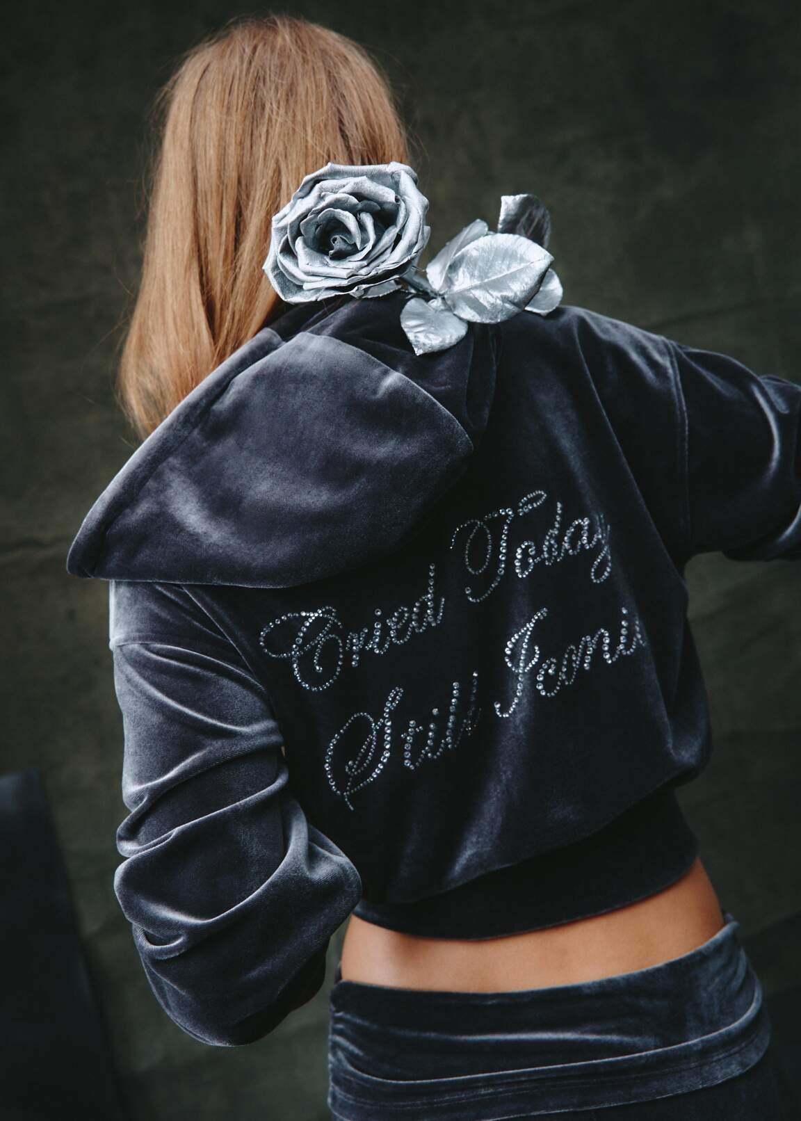 Zip-up sweatshirt with a rhinestone text print on the back. Relaxed fit, dropped shoulders, long sleeves, and a hood. Welt pockets at the front. Elasticated cuffs and hem.