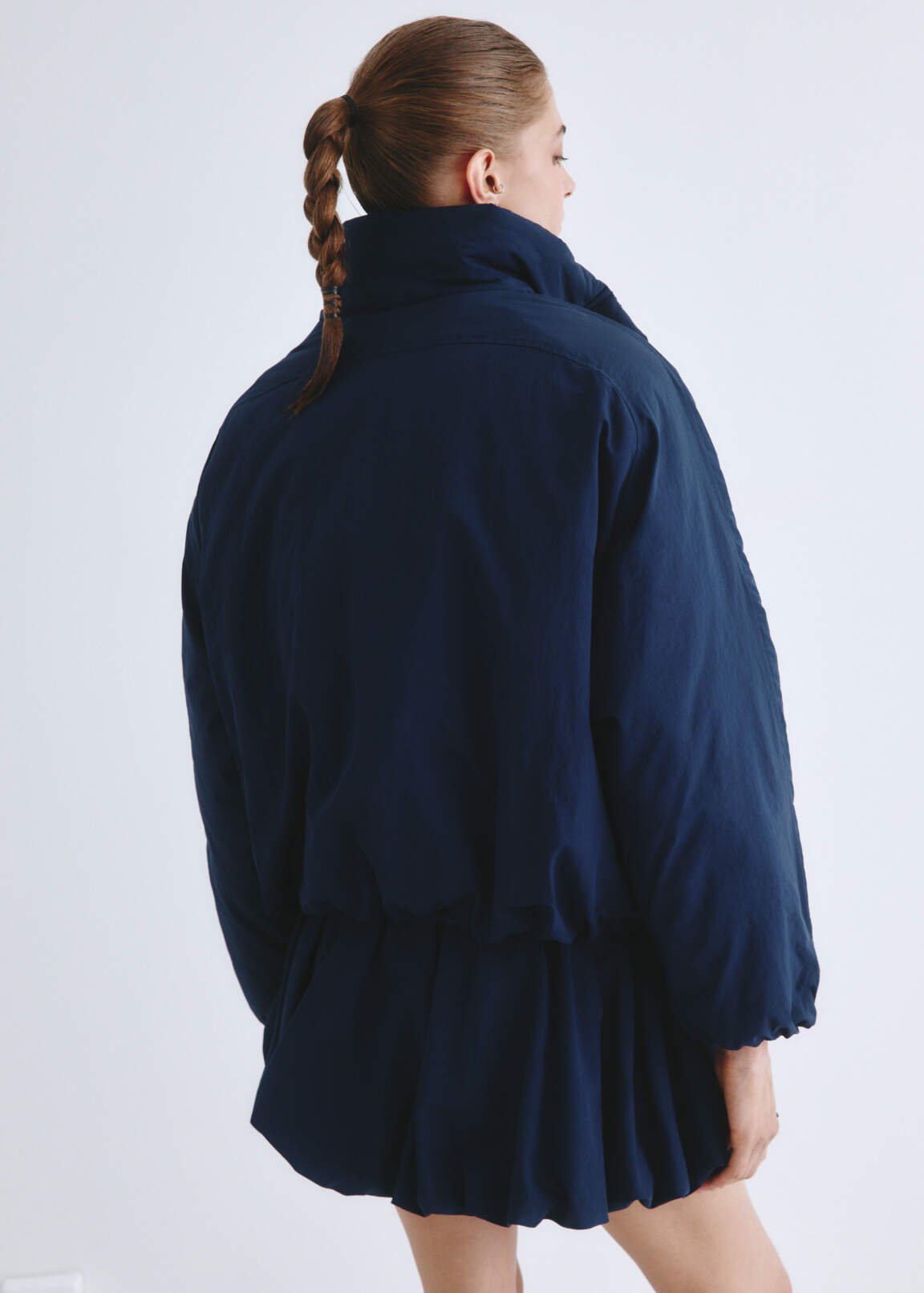 Short puffer jacket with a stand-up collar. Zip fly. Side-seam pockets with concealed snaps. Elastic cuffs and jacket hem. Padded with synthetic padding. Model is wearing a size S. Measurements: 70/58/87 cm, height 178 cm.