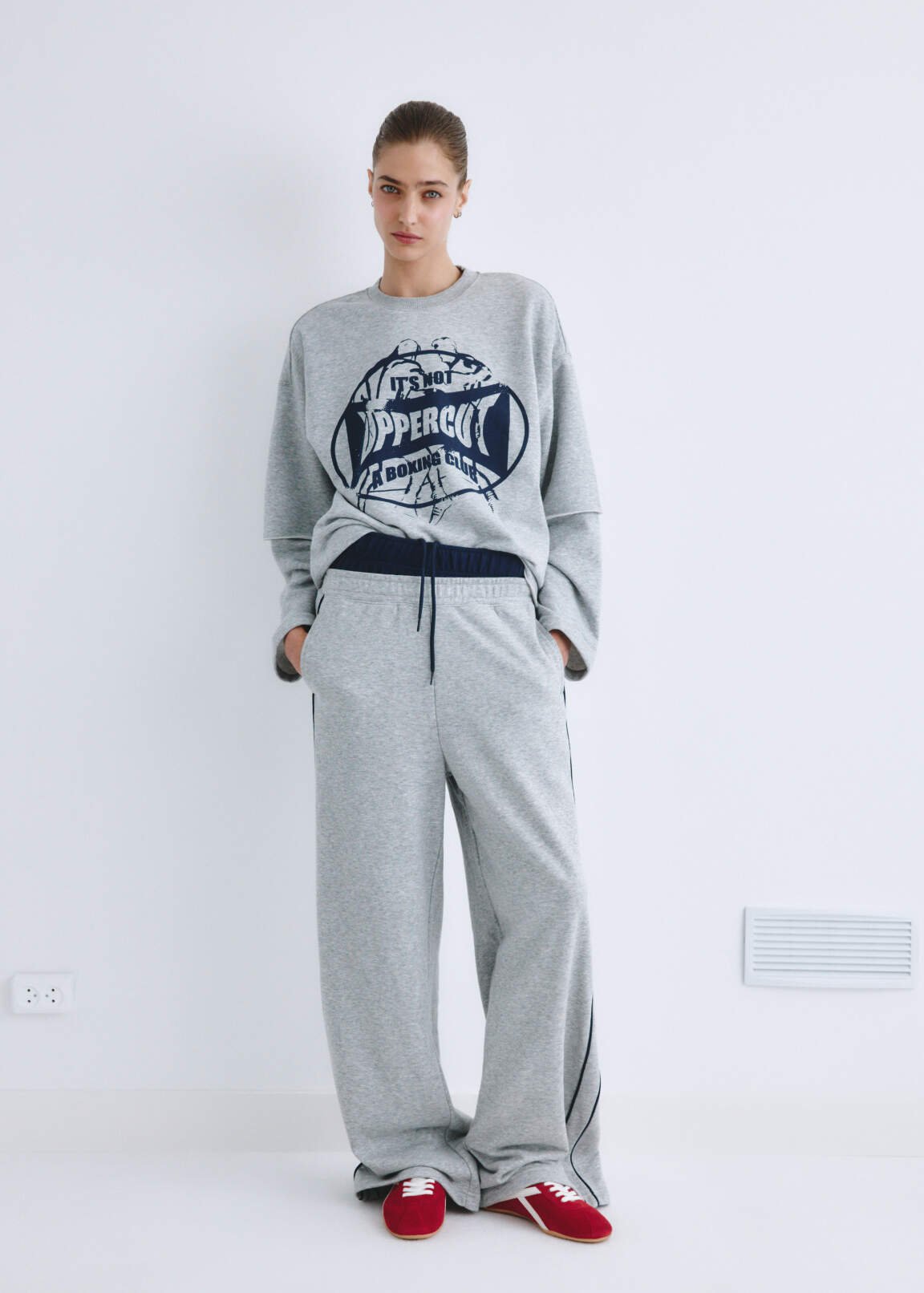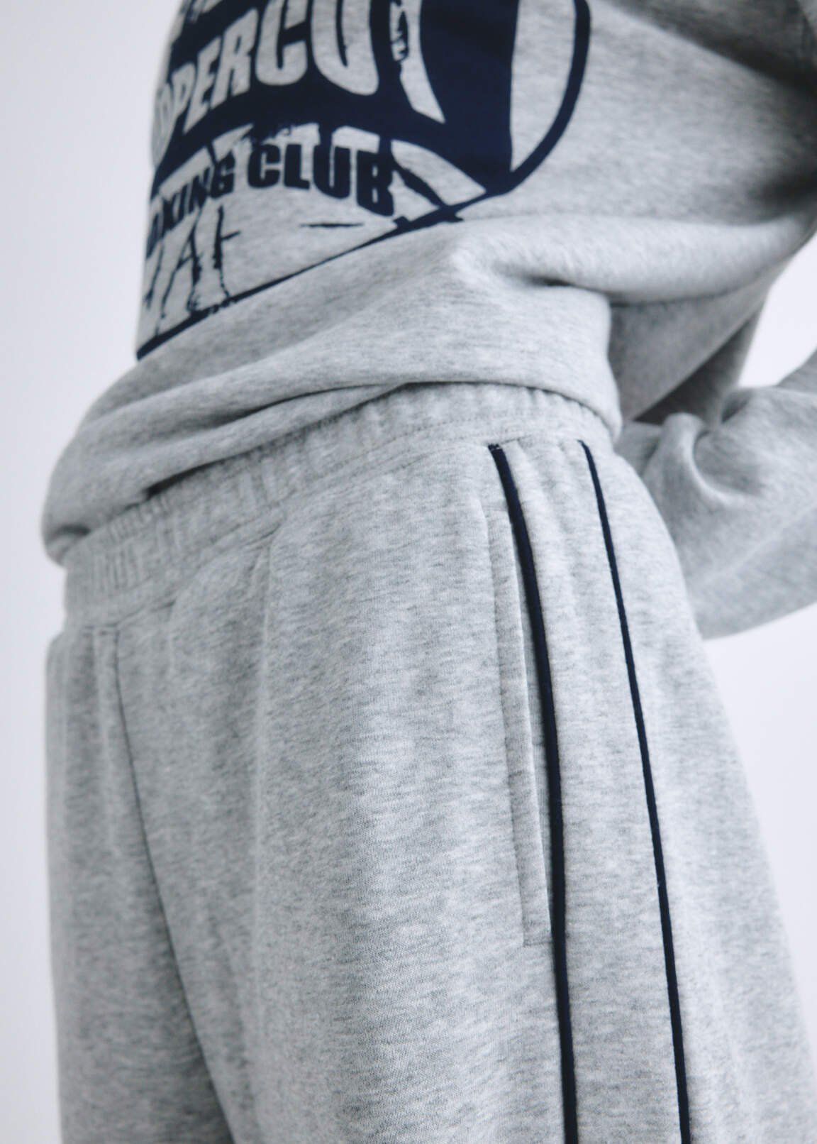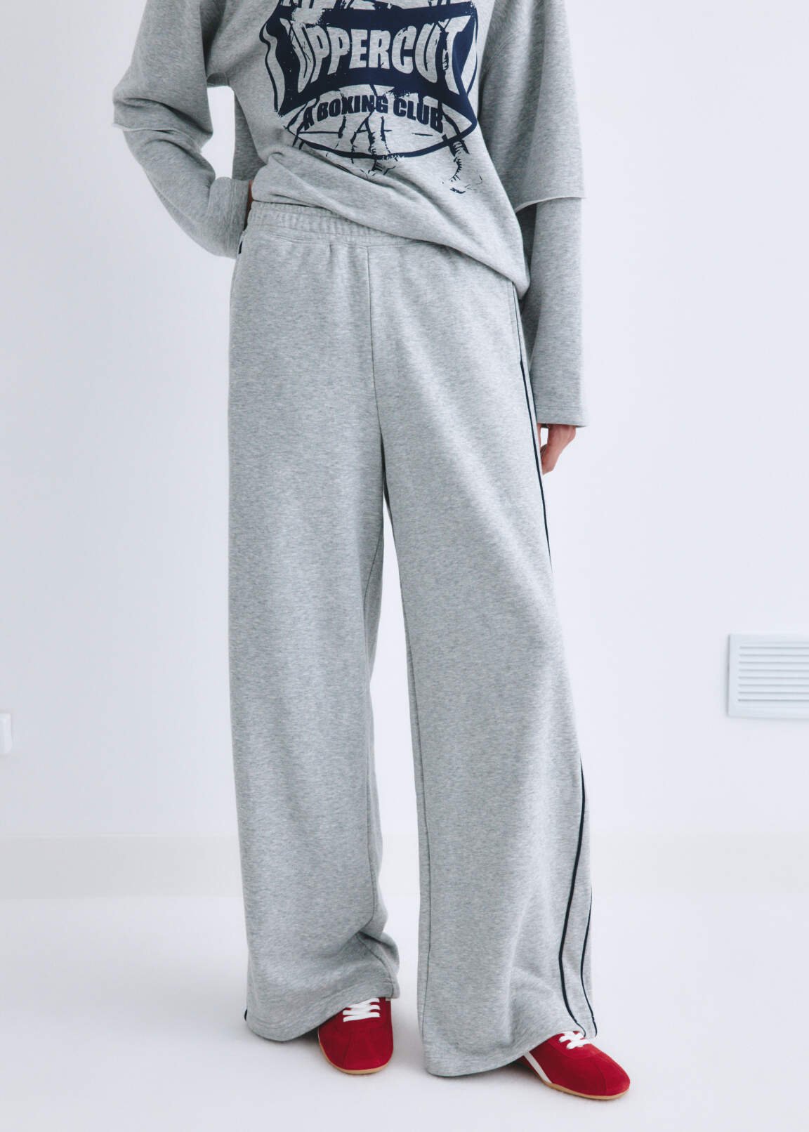 Relaxed-fit sports-style trousers with contrasting stripes. Made from a soft, comfortable cotton-blend jersey. Straight cut with a comfortable mid-rise. Elastic waistband. Side-seam slit pockets. Full-length legs.