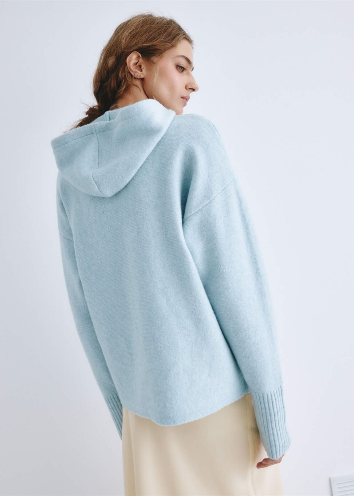 This horizontally knit hoodie features a soft, wool-rich yarn. It features a relaxed fit with dropped shoulders. It features a drawstring hood, long sleeves, and a kangaroo pocket. Ribbed cuffs. The model is wearing a size XS. Measurements: 70/58/87 cm, height 178 cm.